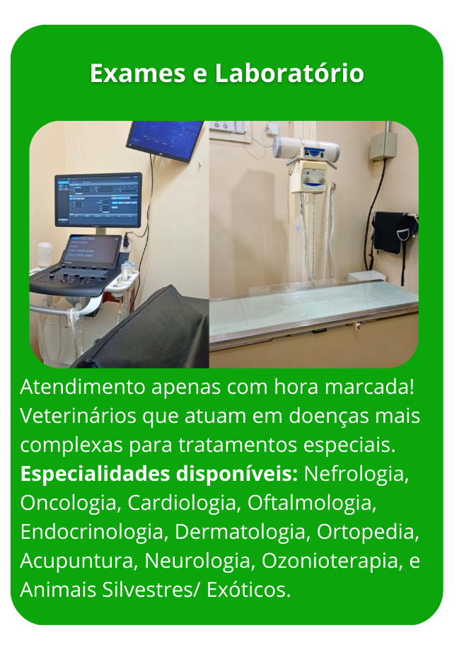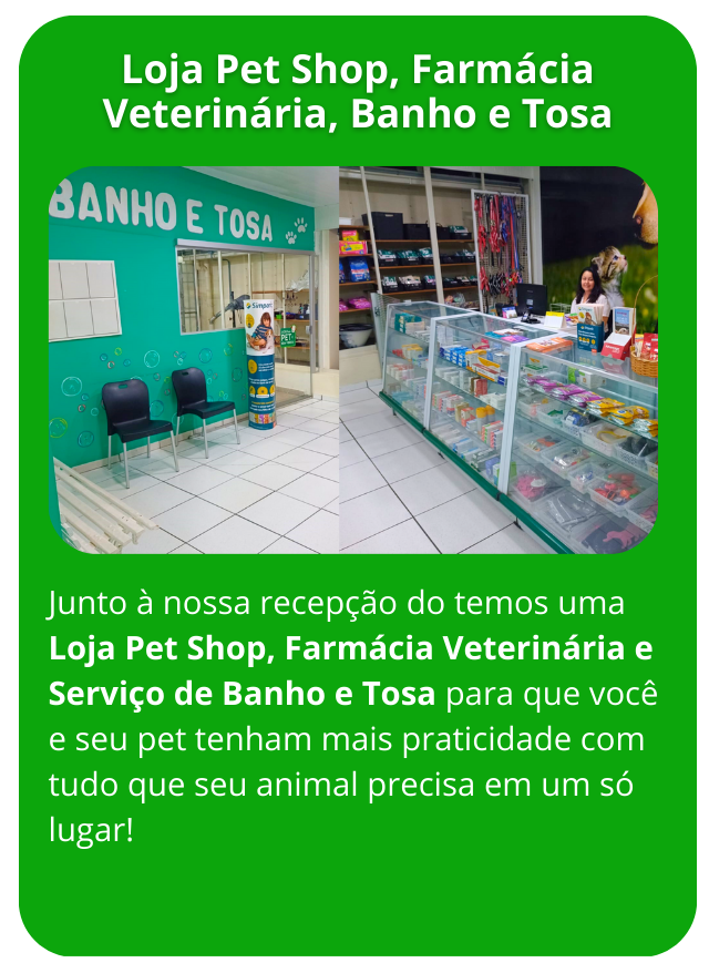 Temos um amplo espaço para os atendimentos normais, urgências e emergências, com vários Consultórios para Consultas com Clínicos Gerais e Especialistas, Vacinação, Internação, Exames de Imagem e Outros, Laboratório Interno, Sala de Cirurgia, Loja Pet Shop, Banho e Tosa e Farmácia Veterinária.
